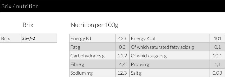 Selection La Fruitière. Made by blending, crushing & refining selected varieties of mango, passion fruit, banana, lime, guava and lychee Exists in: | ||